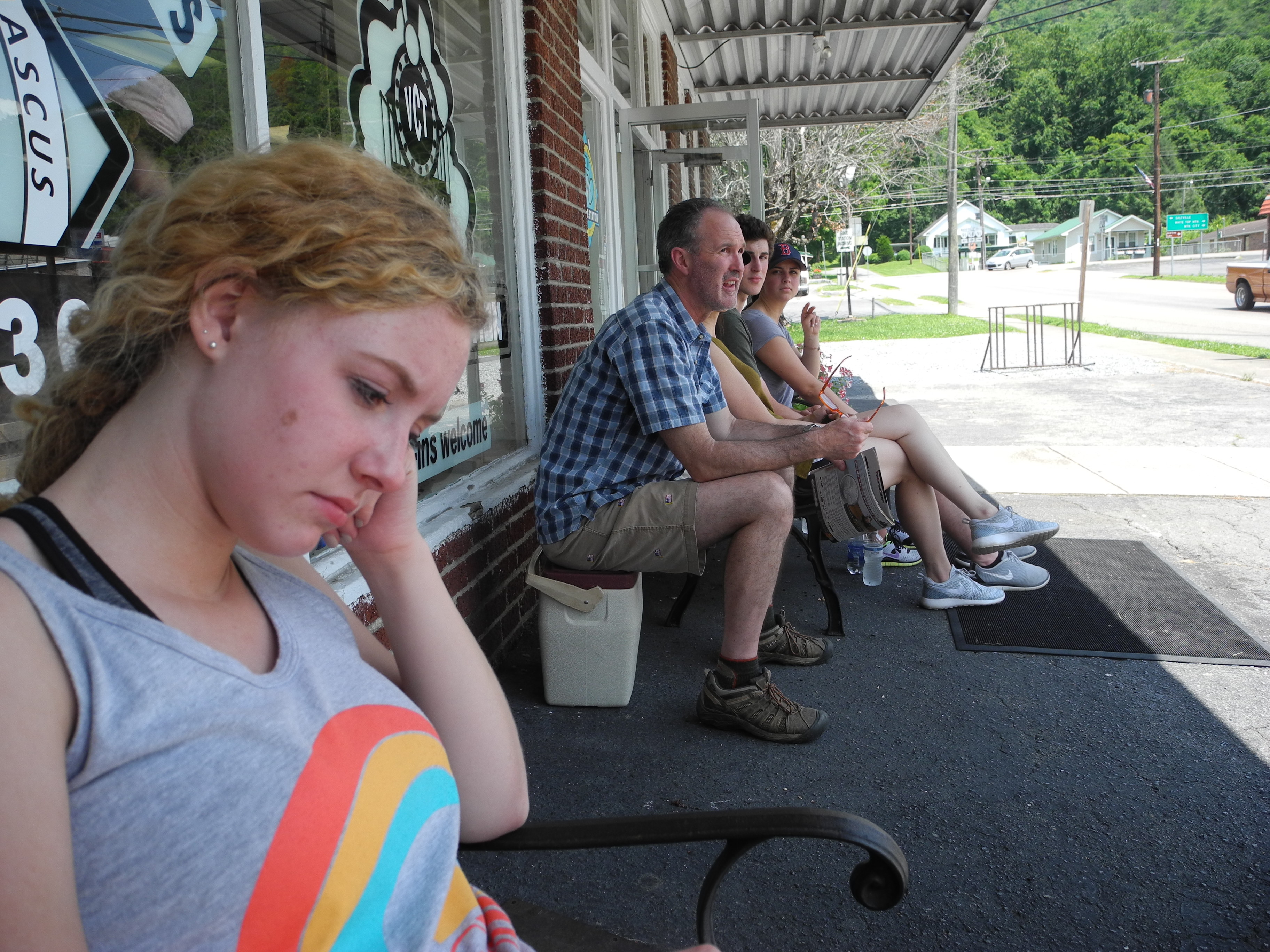 Tired family droops on benches until all stragglers and delighted dalliers wend in,