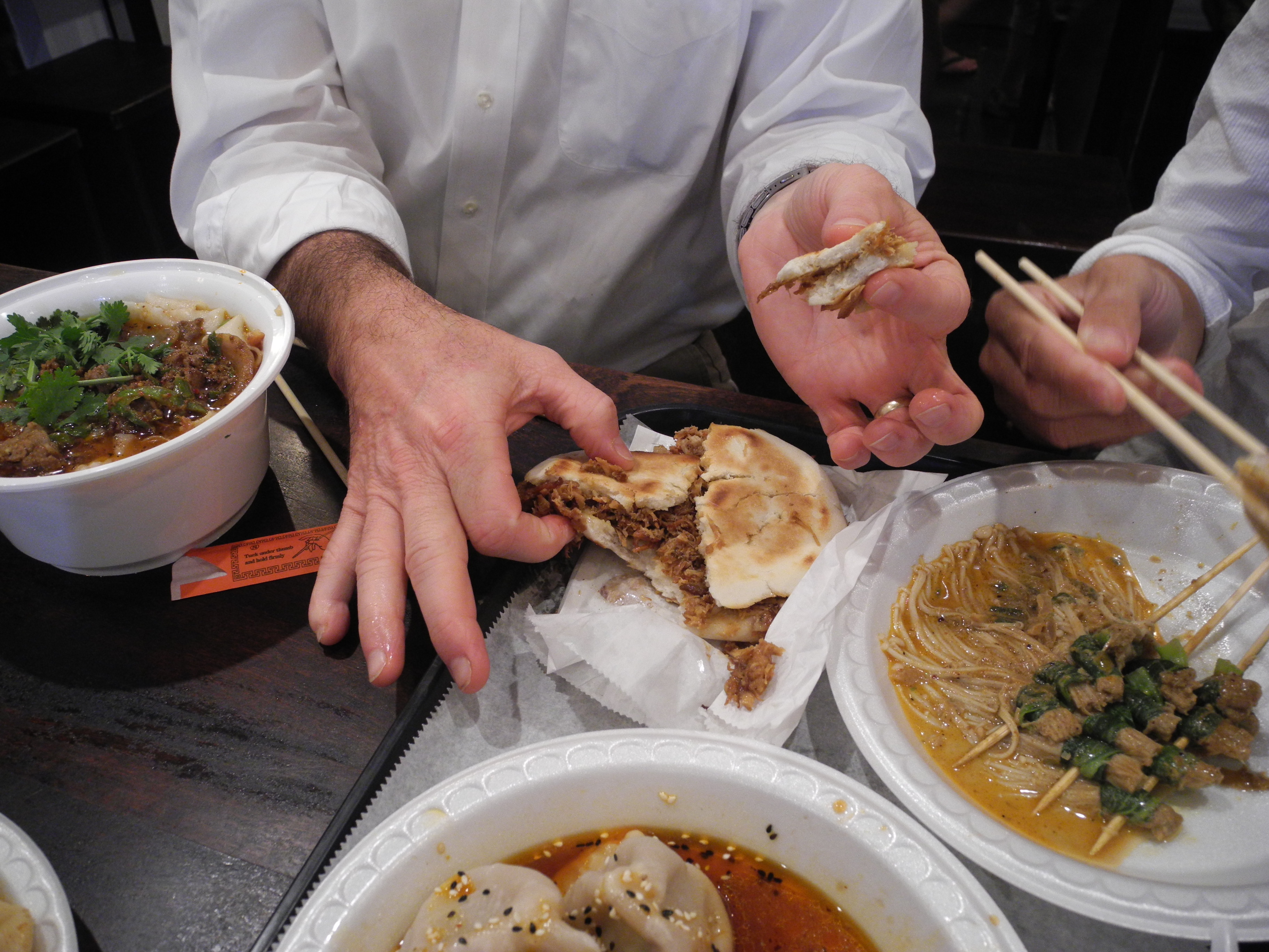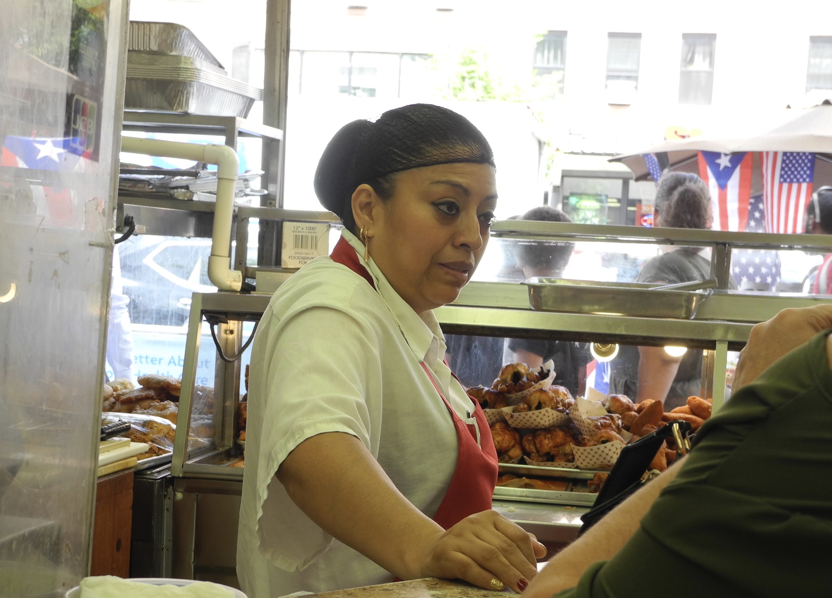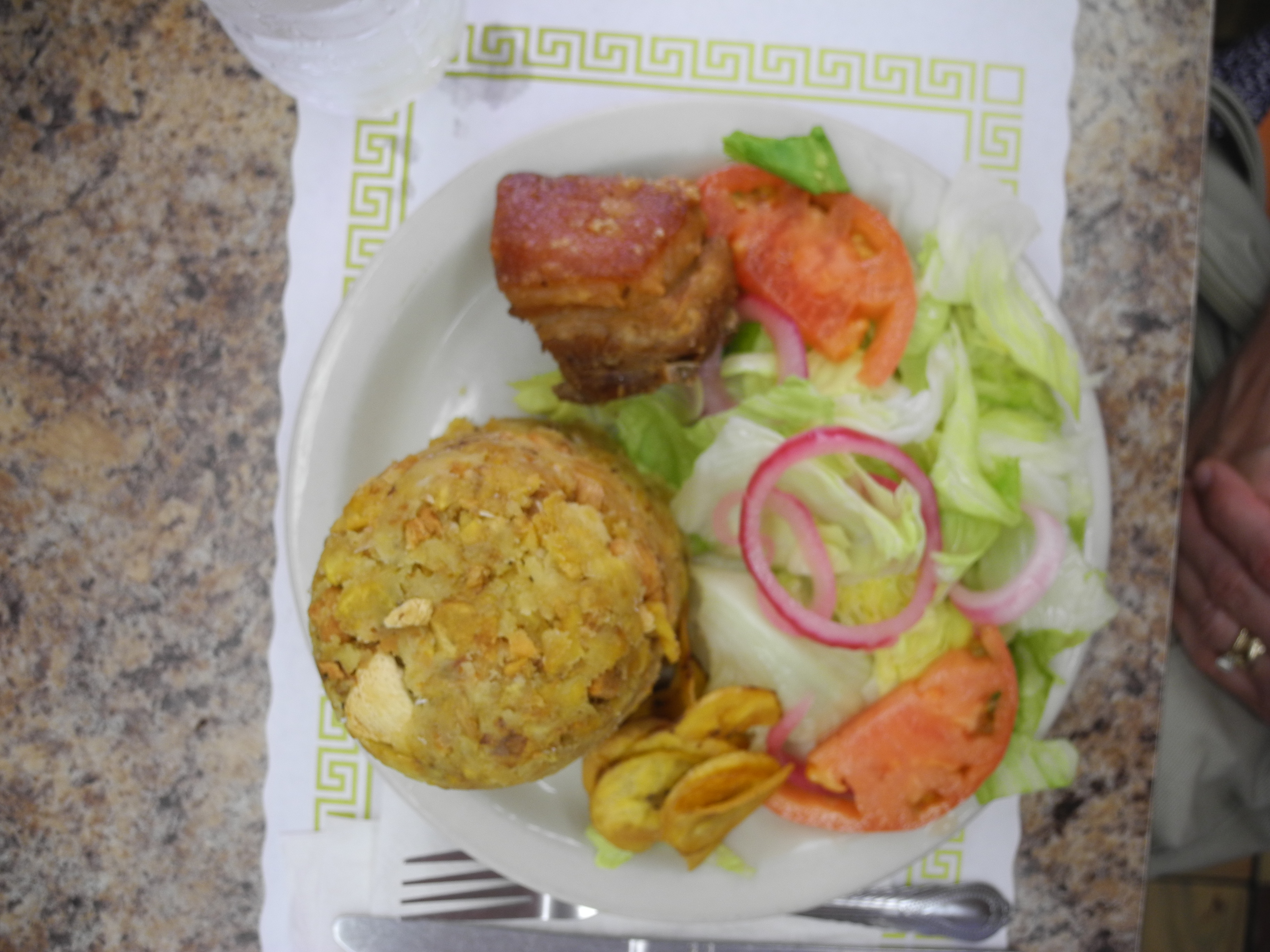 In keeping with a day north of the park, today’s lunch was Puerto Rican. Isn’t she wonderful? That blob on the left was delicious; called mofongo al pilon, it was a little like our turkey dressing only instead of turkey it was crispy pork cracklings and fried chicken chunks, and instead of cornbread it was mashed green plantains. You spooned a mild garlic sauce over it. Plantain chips, cuchifritos, and salad completed this third cultural food foray joining Middle Eastern and Chinese. Yes, I could live here if we needed to plant Tito Puente Presbyterian Church.