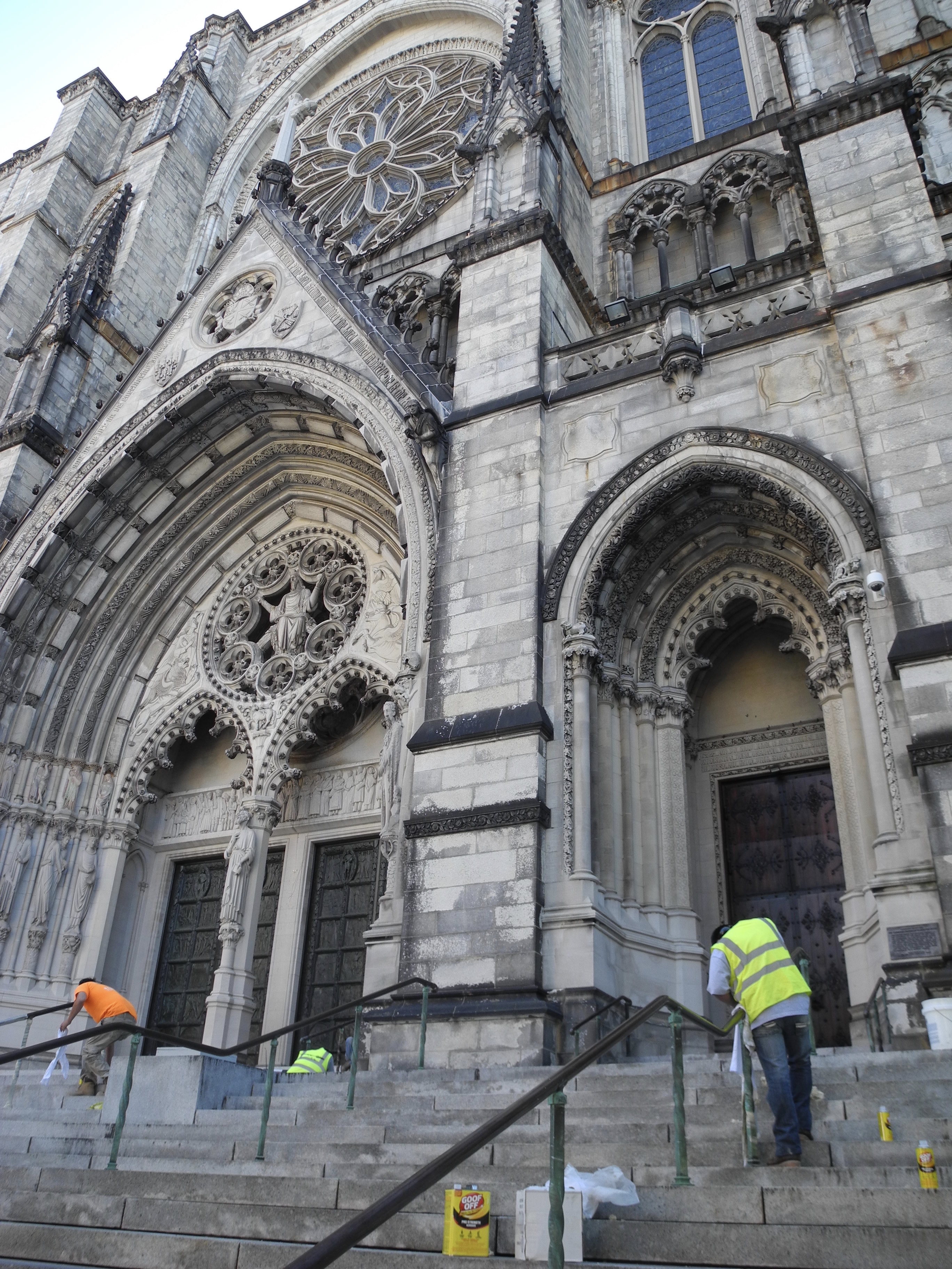 Cathedral of St. John the Divine. The colorful workers used GooGone to clean the rails and listened to mariachi. On a sombre note, a man told Andrew that the massive church, which seats 10,000, averages 300 worshippers. That’s not the sombre part. The fullest day of the year is not Easter or Christmas. No, the man reported enthusiastically, it is early October. Oh, what holiday would that be? “Well, the feast of St. Francis! The blessing of the animals. It’s incredible, the place is packed to overflowing with people and their pets. We had an elephant come for a while. You could go out in the courtyard and the priests would bless individual pets.” I thought of the moneychangers in the temple, such a misuse of a divine place. But then I was reminded that God is where His people are, and Andrew and I are His people.