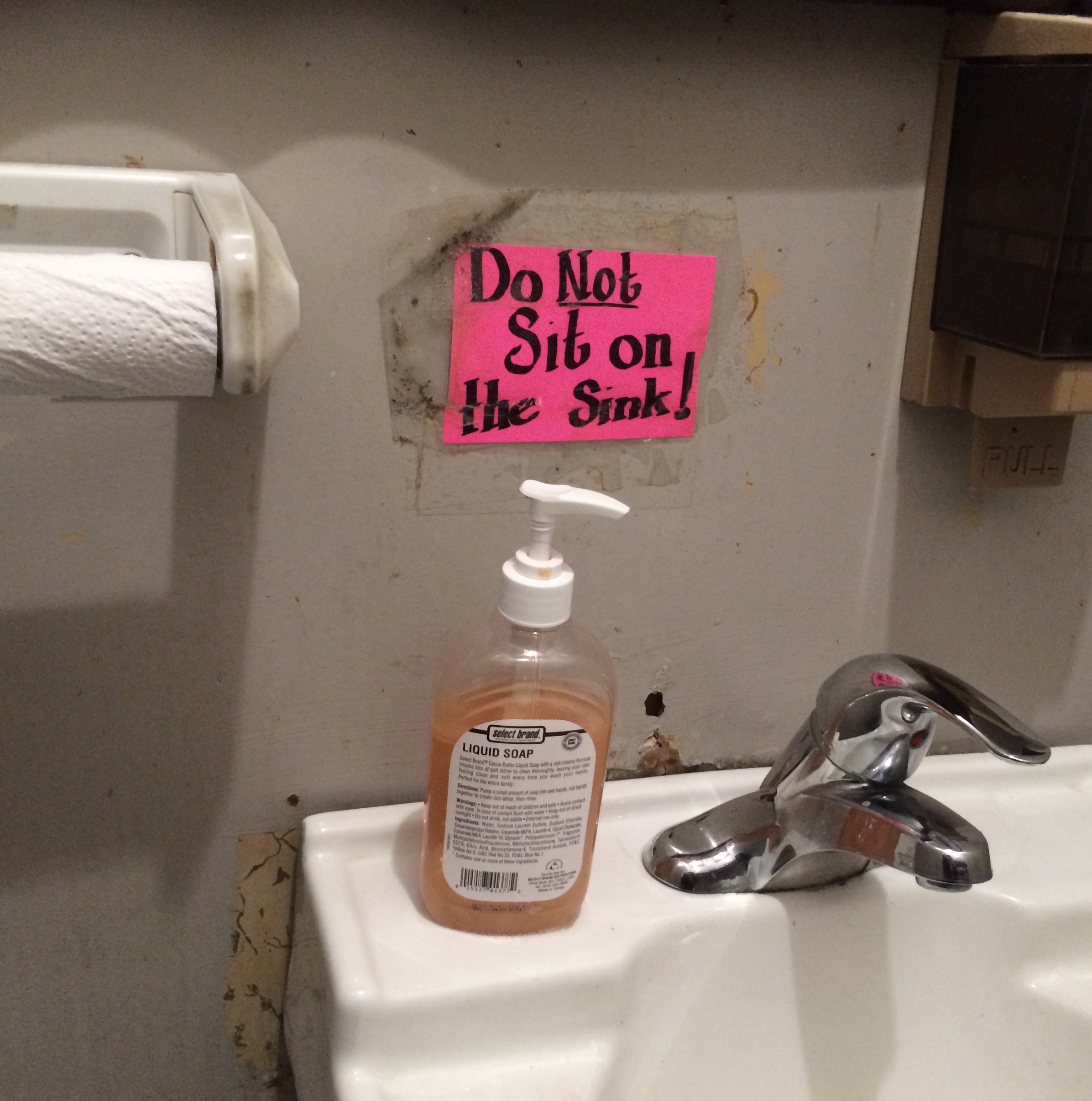 In the Addison Hyatt’s Market ladies’ room – back in civilization, but still elfstruck – I wondered at the situation that made that sign necessary.