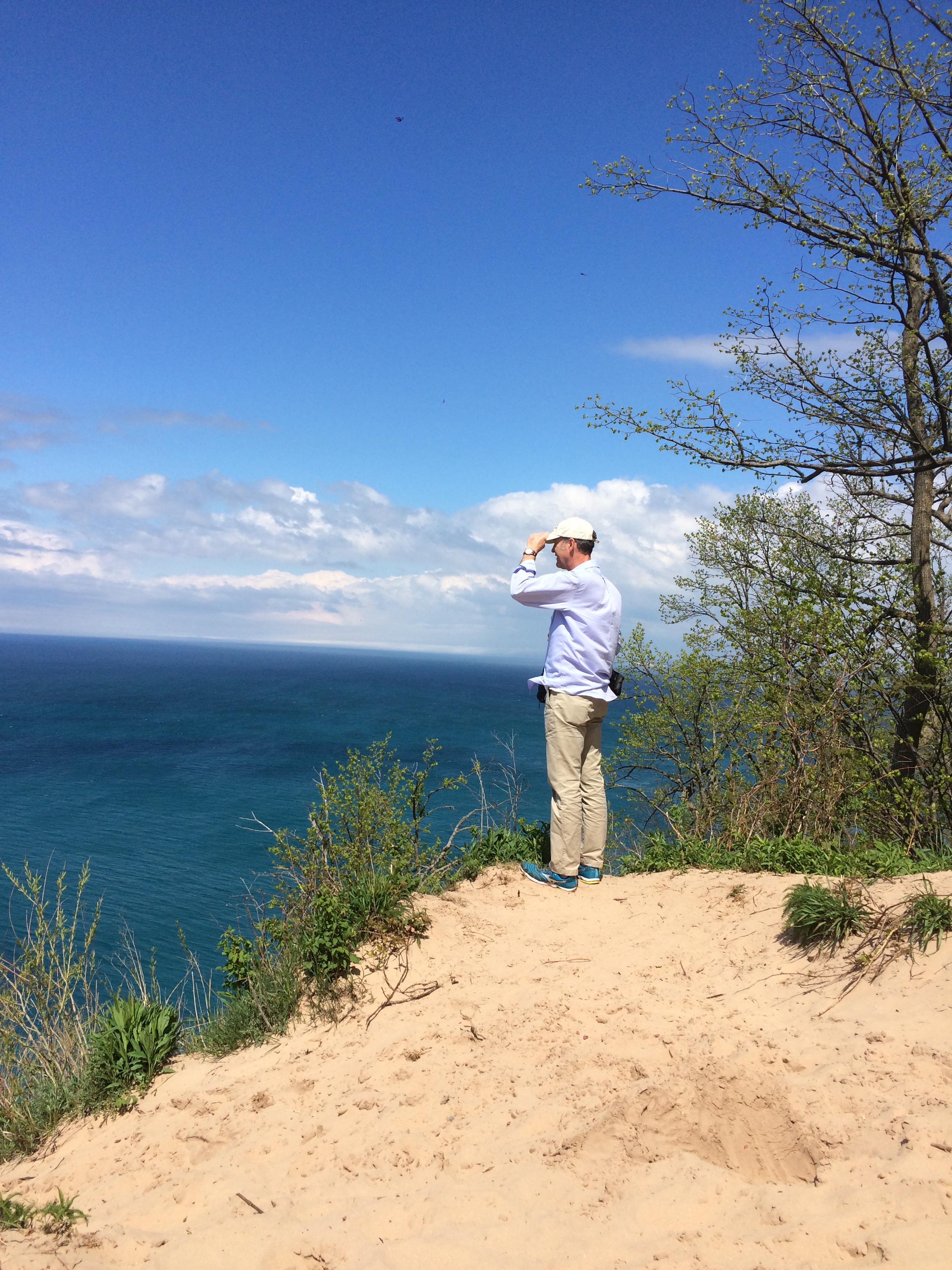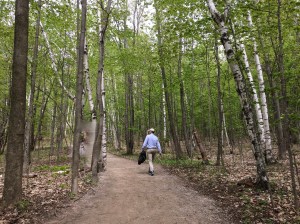 Audubon Bluff Trail. Black squirrels are startling when you are used to plain-Jane grays. White tail deer, fiddle-head ferns conferring together, mosses and sequoias, swamps and cattails, dunes and a tame lapping lake today, Poe’s Raven cawing and Longfellow’s Hiawatha haunting. Michigan, I can’t figure out what you are! But your motley is most beautiful. And oh all the poets, gone but still living, who breathe their cool observations and immortal words to inform my enjoyment. What an extra rich layer of pleasure to know they too stood in green, green woods glimpsing blue water and it came out as a song.
