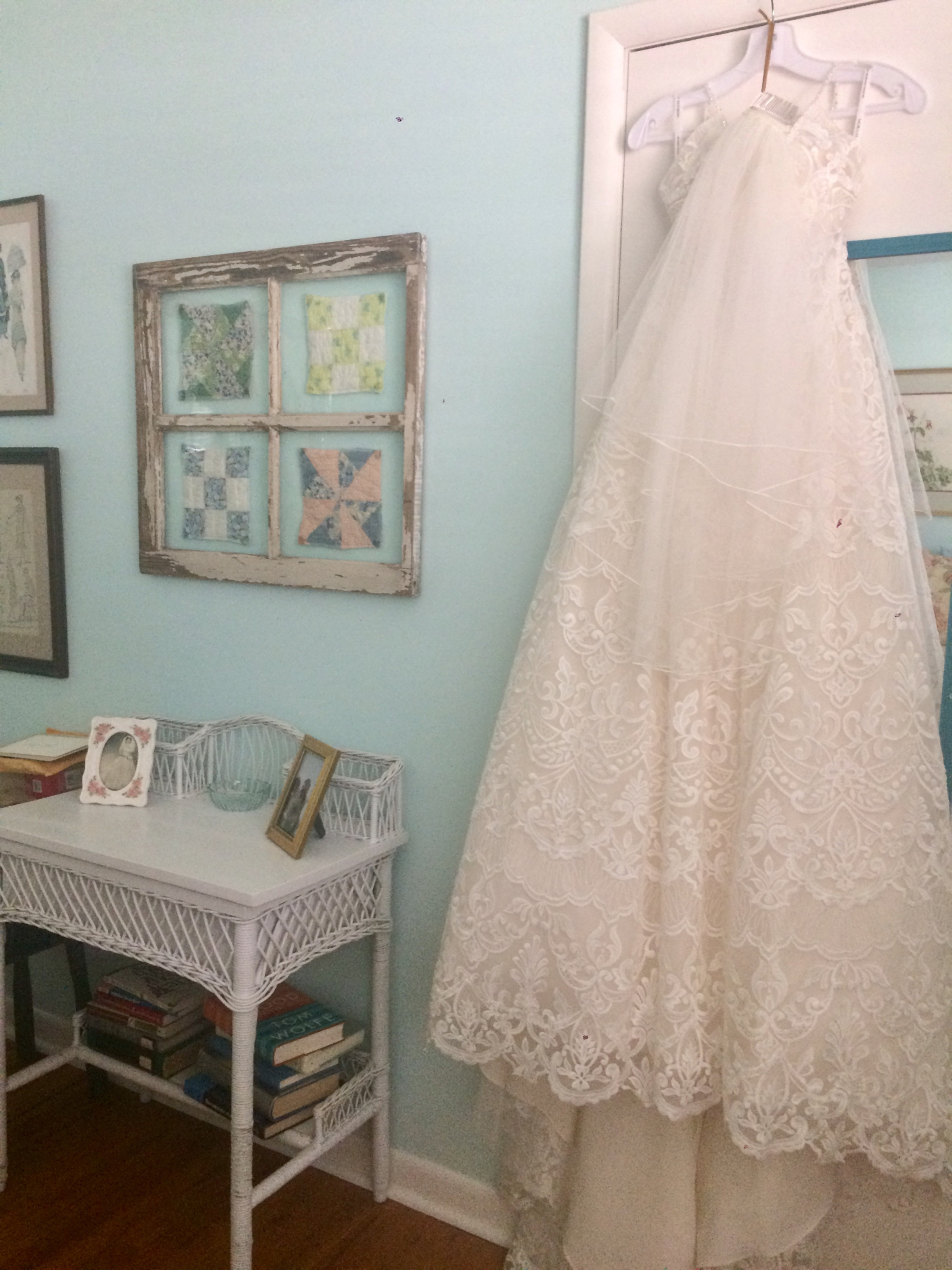 The wedding dress, all lush and white and laced with girlhood, hanging ready in that girl’s room in the dreamy calm before the first arrivals.